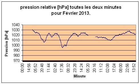 ATTENTION: Données incomplète manque presque 5 jours au total. Base de données du mois (par minute) de Février 2013. Pression relative. Température extérieure. Humidité extérieure. Point de rosée. Windchill (température ressenti). Vitesse du vent. Pluie. Retrouver toutes les données du mois au format microsoft excel et laisser libre court à vos envies de statistique, graphique.... Compresser avec 7-zip. Diagrammes de Février 2013. ![]() ![]() ![]() ![]() ![]() ![]() ![]() Température moyenne par semaine. semaine 05 (vendredi 01 au dimanche 03) 5,77°c semaine 06 (lundi 4 au dimanche 10) 5,77°c semaine 07 (lundi 11 au dimanche 17) 5,15°c semaine 08 (lundi 18 au dimanche 24) 1,53°c semaine 09 (lundi 25 au jeudi 28) 2,30°c